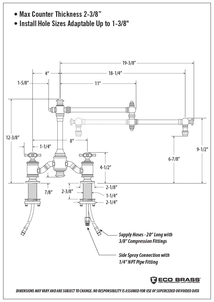 • Two-holed Bridge Faucet design mounts 8” on center.